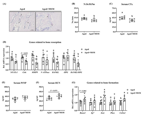 The alterations of aged mice responses to MSM supplementation in drinking water. (A) Tartrate-resistant acid phosphatase (TRAP) staining, in which the positive-TRAP cells (osteoclast) were indicated by the black arrow, and (B) the frequency of osteoclasts (N.Oc/B.Pm) were determined. (C) Serum C-terminal telopeptide of type I collagen (CTx) content reflects bone resorption. (D) The mRNA expression of genes related to bone resorption in tibia, including nuclear factor of activated T-cells, cytoplasmic, calcineurin dependent 1 (NFATc1), receptor activator of nuclear factor-κB ligand (RANKL), osteoprotegerin (OPG), cathepsin K (Ctsk), matrix metallopeptidase 9 (MMP9), and vacuolar-type H+-ATPase (V-ATPase). Serum bone formation biomarkers such as (E) N-terminal propeptide of procollagen type I (P1NP) and (F) osteocalcin (OCN). (G) The mRNA expression of genes related to bone formation in tibia, including runt related transcription factor 2 (Runx2), Sp7 transcription factor 7 (Sp7), sclerostin (Sost), phosphate regulating endopeptidase homolog x-linked (Phex), and collagen type I alpha 1 (Col1a1). a,b Values (mean ± standard deviation; n = 6) with different letters represent statistical significance at p < 0.05.