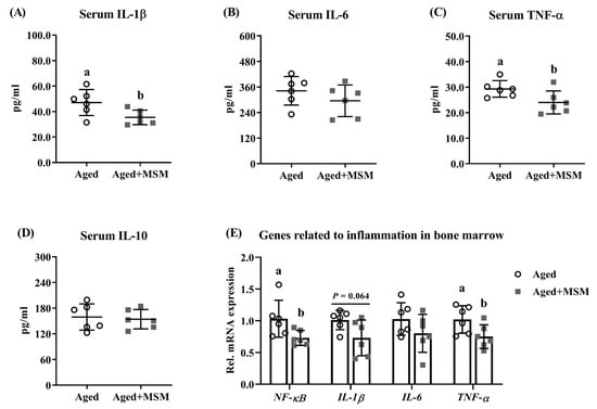MSM supplementation in drinking water suppresses inflammatory response in aged mice. The concentrations of inflammatory cytokines such as (A) interleukin-1 beta (IL-1β), (B) interleukin-6 (IL-6), (C) tumor necrosis factor-alpha (TNF-α), and (D) interleukin-10 (IL-10). (E) The mRNA expression of genes related to inflammation in bone marrow, including nuclear factor-kappa B (NF-κB), IL-1β, IL-6, TNF-α. a,b Values (mean ± standard deviation; n = 6) with different letters represent statistical significance at p < 0.05.