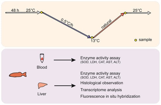 Six-month-old leopard coral groupers with an average weight of 19.0 ± 2.1 g were provided by Chenghai Aquaculture Co., Ltd. in Dongfang City, Hainan Province, China. The 150 P. leopardus individuals were equally divided into three 100 L tanks. Using a chiller and a circulation pump, the water temperature was gradually reduced from 25 °C to 13 °C at a rate of 0.5 °C per hour over a 24 h period. The cooling process was then halted, allowing the water temperature to naturally return to 25 °C. The collected samples were categorized into three groups based on three specific sampling time points: the normal temperature group (25 °C), the low-temperature group (13 °C), and the recovery temperature group (R-25 °C). Sampling was conducted at 11 PM on the first day, 11 PM on the second day, and 11 AM on the third day. These sampling points are clearly indicated in Figure 1, providing a visual representation of the experimental timeline. Six individuals from each group were anesthetized with MS222. Blood samples were collected using sterile syringes and stored at 4 °C for enzyme activity assay. Part of the liver tissues were fixed by 4% paraformaldehyde solution and sequentially dehydrated by immersing them in 30%, 50%, 70%, 80%, and 90% ethanol, followed by absolute ethanol, for 2 h each and stored in 100% ethanol. The other part of liver tissue was treated with liquid nitrogen and stored at −80 °C for RNA extraction and enzyme activity assay (Figure 1).