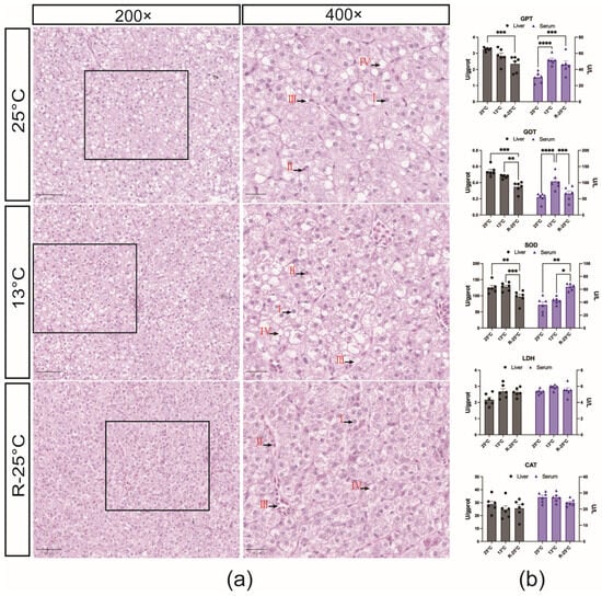 Serum enzyme activities of SOD, GOT, GPT, CAT, and LDH were measured in three parallel samples from the normal temperature group (25 °C), low-temperature group (13 °C), and recovery temperature group (R-25 °C). As shown in Figure 2b, no significant differences were observed in the activities of LDH and CAT among the three groups. However, significant differences were found in the activities of SOD, GOT, and GPT. These enzymes also showed corresponding activity changes in liver tissue homogenates. SOD, which plays a crucial role in cellular stress responses and metabolism, exhibited a significant upregulation in the R-25 °C group, with activities markedly higher than those in the normal and low-temperature groups. GOT and GPT activities are critical indicators of liver function. Our results demonstrated that both GOT and GPT were significantly elevated in the low-temperature group (p < 0.05), with GOT showing a marked decrease in the recovery group.