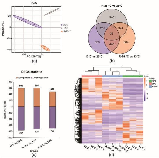 Firstly, the PCA results revealed the samples from one group were clustered together, respectively (Figure 3a), indicating that the temperature fluctuation caused obvious changes in gene expression patterns. Subsequently, pairwise comparisons between groups were set up to perform DEGs analysis. As displayed in Figure 3b, a total of 2744 DEGs were identified from three comparison groups, among which, 35 DEGs were shared in all three comparison groups (Figure 3b) Subsequently, the number of upregulated or downregulated DEGs in each comparison group is concluded in Figure 3c. In addition, the expression heatmap of all DEGs also demonstrated that there was clear separation between groups in the gene expression profile (Figure 3d). More detailed information of DEGs was concluded in Table S3.