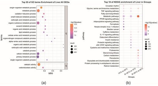 To investigate the functional implications of genes exhibiting significant transcriptional changes in response to temperature variations in the liver of P. leopardus, GO and KEGG enrichment analyses were performed on all DEGs. The GO analysis revealed that among the top 20 significantly enriched terms, 18 were associated with biological processes (BP), and two were linked to molecular functions (MF). The majority of these terms were related to catabolic metabolism. Notably, both BP and MF categories demonstrated significant enrichment in oxidation-reduction processes, including “oxidation-reduction process” and “oxidoreductase activity”, as illustrated in Figure 4a.