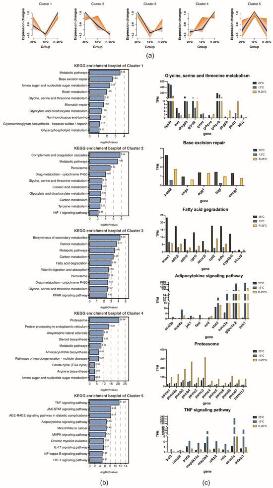 Trend analysis of DEGs and functional analysis in the liver of P. Leopardus under temperature changes. (a) Trend analysis of DEGs. (b) KEGG enrichment results of DEGs from five clusters. (c) Expression analysis of representative DEGs in key pathways under temperature changes.