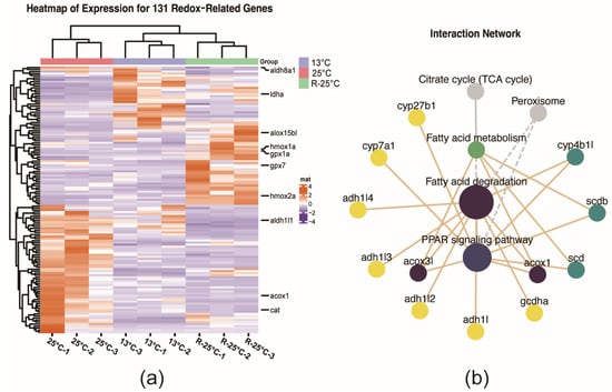 The regulation of redox DEGs under temperature fluctuations. (a) Heatmap of expression levels for 131 genes related to redox processes. (b) Network diagram between redox-related genes and fatty acid metabolism pathways.