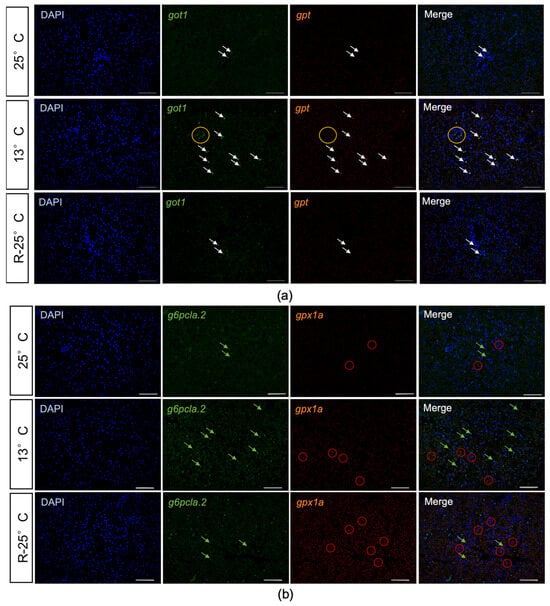 Furthermore, FISH was carried out to further validate the expression of DEGs. As shown in Figure 8a, the signals of got1 and gpt were not obvious in the 25 °C group. In the 13 °C group, the expressions of got1 and gpt in the hepatocyte nuclei were significantly increased. In the R-25 °C group, the expression levels of got1 and gpt were reduced compared to the 13 °C group. Notably, in the 13 °C group, the nuclei of cells with high expression of got1 and gpt exhibited irregular and non-circular shapes (indicated by arrows), and cells on the vascular walls showed concentrated signals of got1 mRNA (indicated by circles). In addition, the DEGs related to glutathione peroxidase were also validated by FISH (Figure 8b).