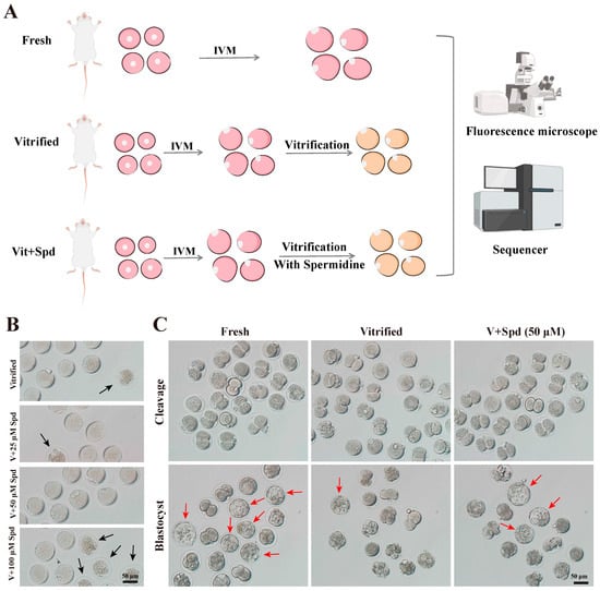 Effects of spermidine supplementation on survival rate and embryonic development after freezing: (A) Test flow chart. (B) Effect of different concentrations of spermidine on matured oocytes after vitrification freezing. Black arrows indicate dead oocytes. (C) Effects of fresh group, vitrification-frozen group, and addition of 50 μmol/L spermidine on in vitro fertilisation development rate. Red arrows indicate dead oocytes blastocyst.