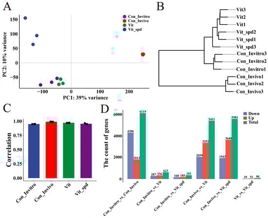 Differentially expressed genes before and after vitrification freezing: (A) PCA plot showing the distribution of Con_invitro, Con_vivo, vit, and vit + Spd groups after dimensionality reduction. (B) Hierarchical clustering of individual samples from the Con_invitro, Con_vivo, vit, and vit+Spd groups using the ward.D2 method, observing distances between and within groups. (C) The correlation bar graph shows the correlation of the groups. (D) Differently expressed gene analysis using Deseq2 was followed by bar graphs showing the differentially expressed genes between the Con_invitro, Con_vivo, vit, and vit+Spd groups.