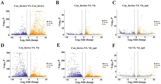 Volcano plots between Con_Invitro, Con_Invivo, Vit, and Vit +Spd groups.(A–F) The relationship between log2 (fold change) and −Log2 p-value between each of the two groups is shown using a volcano plot.