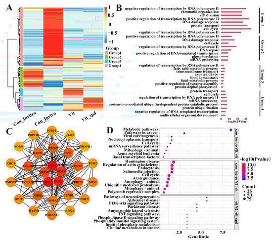 The KEGG enrichment analysis (Figure 4D) showed that differentially expressed genes in Con_Invitro versus Vit were mainly enriched in the pathways of metabolic pathways, pathways in cancer, viral carcinogenesis, nucleocytoplasmic transport, etc. Con_Invivo and Vit differentially expressed genes were mainly enriched in regulation of actin cytoskeleton, endocytosis, cell cycle, mitophagy–animal, and other pathways. In contrast, the differentially expressed genes of Vit and Vit_Spd were predominantly enriched in pathways associated with neurodegeneration, the Phosphatidylinositol 3-Kinase—Protein Kinase B signalling pathway(PI3K-Akt), the TNF signalling pathway, and the Phospholipase D signalling pathway. Finally, a Protein–Protein Interaction Network analysis (PPI) was performed on the differentially expressed genes (Figure 4C), and a total of five HUB genes were identified, namely THO complex subunit 2 (THOC2), Serine/Arginine-rich splicing factor 3 (SRSF3), Serine/Arginine-rich splicing factor 2 (SRSF2), Retinoblastoma binding protein 7 (RBBP7), and Serine/Arginine repetitive matrix 1 (SRRM1).