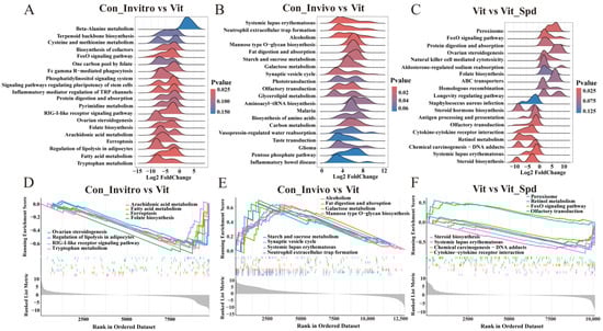 The following study was conducted with the objective of investigating the effect of freezing and Spd treatment on the pathways by all gene expressions. To this end, gene set enrichment analyses (GSEAs) were subsequently conducted, resulting in the generation of ridge plots and enrichment score line graphs, respectively. A comparison was made between the Con_invitro and Vit groups, and it was observed that, among the Top 20 ranked pathways, the majority exhibited a tendency towards down-regulation, with the exception of Beta-Alanine metabolism (Figure 5A,D). Upon observation, it was found that these pathways were predominantly enriched in the Con_Invitro and Vit groups, particularly in ovarian steroidogenesis, RIG-I-like receptor-signalling pathway, signalling pathways regulating pluripotency of stem cells, and a variety of metabolism-related pathways. In contrast, Con_Invivo exhibited a tendency towards up-regulation in all of the top 20 pathways in comparison to Vit (Figure 5B,E), predominantly concentrated in the pentose phosphate pathway, systemic lupus erythematosus, synaptic vesicle cycle, and a variety of amino acid and sugar metabolism processes. Vit exhibited up-regulation in 10 of the top 19 pathways and down-regulation in 9 compared to Vit_Spd, primarily enriched in Peroxisome, FoxO-signalling pathway, ovarian steroidogenesis, ABC transporters, homologous recombination, retinol metabolism, and other pathways. The results demonstrated that the addition of Spd during the freezing process was capable of rescuing approximately 47.3% of the aberrant pathways (Figure 5C), which is consistent with the results of Spd on the rescue of differentially expressed genes (Figure 3B,C). Based on the above results, it is clear that there is a large difference between in vivo matured and in vitro matured oocytes, and the vitrified frozen oocytes used in this experiment all originated from in vitro maturation. Therefore, all subsequent analyses were based on in vitro maturation as a control group.