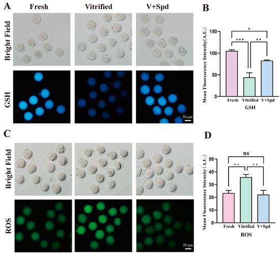 Oxidative stress levels strongly and negatively correlated with oocyte recovery after vitrification freezing. Given the potent antioxidant properties exhibited by spermidine, we investigated its potential to mitigate the adverse effects associated with oocyte vitrification. We examined intracellular oxidative stress levels by assessing glutathione (GSH) and reactive oxygen species (ROS) levels. As Figure 6 clearly shows, GSH levels in vitrified oocytes were significantly lower than in the fresh group (p < 0.01), and ROS levels were significantly higher than in the fresh group (p < 0.01). This proved that vitrification freezing caused oxidative stress in oocytes. However, adding 50 μmol/L spermidine during the freezing process (V + Spd) led to a significant decrease in ROS levels (p < 0.01) and a substantial increase in GSH levels (p < 0.01). The results were clear that adding spermidine to the freezing process reduced ROS levels and increased GSH levels in vitrified-frozen oocytes.