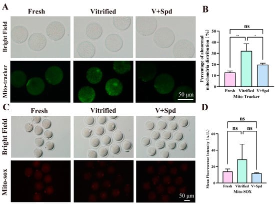 Effect of spermidine on mitochondrial distribution and reactive oxygen species levels in vitrified oocytes: (A) Mitochondrial distribution was visualised using Mito-tracker. Fluorescence evenly distributed in the cytoplasm was identified as a normal mitochondrial distribution as shown in the fresh group, while clusters of fluorescence showing irregularity were identified as an abnormal mitochondrial distribution as shown in the vitrified group. (C) Reactive oxygen species levels were visualised using Mito-sox, with higher fluorescence intensity indicating higher levels of reactive oxygen species. (B,D) Histogram of fluorescence intensity statistics for each group, showed in Mean ± SD. ns indicates p > 0.05, * indicates p < 0.05, and ** indicates p < 0.01.