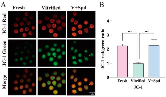 JC-1 was used to investigate the effect of vitrification freezing on mitochondrial membrane potential of oocytes. (A) Visualisation of mitochondrial membrane potential using the JC-1 probe. At high mitochondrial membrane potentials, JC-1 aggregates in the mitochondrial matrix, forming polymers that show red fluorescence (functional mitochondria). At low mitochondrial membrane potential, JC-1 fails to accumulate in the matrix of mitochondria, and then JC-1 is a monomer and shows green fluorescence (impaired mitochondria). (B) Histogram quantifying the ratio of red fluorescence (functional mitochondria) to green fluorescence (impaired mitochondria), showed in Mean ± SD. *** indicates p < 0.0001.