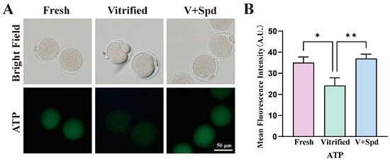 Effect of spermidine on the ATP content of vitrified oocytes: (A) Visualisation of ATP levels in oocytes using the BODIPY™ FL ATP Probe, with higher fluorescence intensity indicating higher ATP levels. (B) Histogram plots of fluorescence intensity for the fresh, vitrified and V+Spd groups, showed in Mean ± SD. * indicates p < 0.05, and ** indicates p < 0.01.