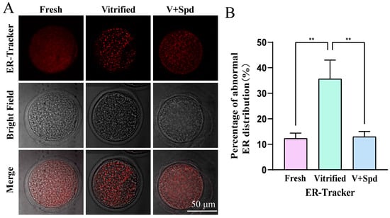 Effect of spermidine on endoplasmic reticulum distribution in vitrified oocytes: (A) Even distribution of fluorescence in the cytoplasm of oocytes is considered to be a normal endoplasmic reticulum distribution as shown in fresh group, while clusters of fluorescence or uneven distribution in the cytoplasm are considered to be an abnormal endoplasmic reticulum distribution as shown in vitrified group. (B) Histogram of fluorescence intensity statistics for each group, showed in Mean ± SD. ** indicates p < 0.01.