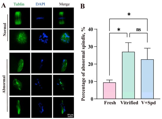 Effect of spermidine on spindle morphology of vitrified oocytes: (A) The spindle is visualised using the anti-α-tubulin-FITC antibody, with the figure depicting two normal spindle morphologies, as well as three abnormal spindle morphologies. (B) The proportion of abnormal spindle bodies in each group was counted and expressed using Mean ± SD. ns indicates p > 0.05, * indicates p < 0.05.