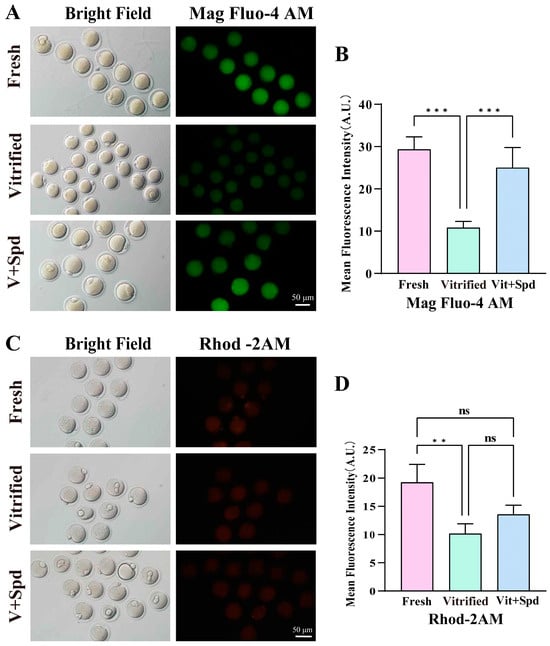 Effect of spermidine on calcium homeostasis in vitrified frozen mouse oocytes: (A) Total intra-oocyte calcium levels were visualised using the Mag Fluo-4 AM probe. Higher fluorescence intensity indicates higher intracellular calcium levels. (C) Mitochondrial-specific calcium levels in oocytes were visualised using the Rhod-2 AM probe. Stronger fluorescence intensity indicates higher calcium levels within the mitochondria. (B,D) Histogram of fluorescence intensity statistics for each group, showed in Mean ± SD. ns indicates p > 0.05, ** indicates p < 0.01. *** indicates p < 0.0001.