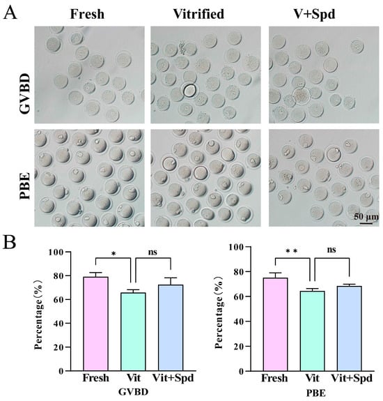 Effect of spermidine on the in vitro maturation of frozen oocytes: (A) Microscopic photographs of the germinal vesicle breakdown and the expulsion of the first polar body in the fresh, vitrified, and V + Spd groups. (B) Statistical histograms of germinal vesicle breakdown and first polar body expulsion for fresh, vitrified, and V+Spd groups, shown in Mean ± SD. ns indicates p > 0.05, * indicates p < 0.05, and ** indicates p < 0.01.