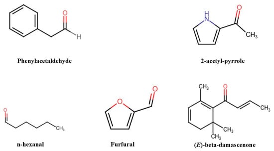 - Tsuzuki, S. Higher Straight-Chain Aliphatic Aldehydes: Importance as Odor-Active Volatiles in Human Foods and Issues for Future Research. J. Agric. Food Chem. 2019, 67, 4720–4725. [Google Scholar] [CrossRef]