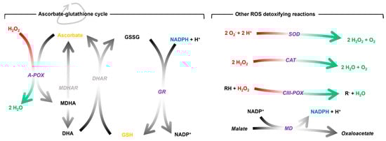 Schematic representation of the antioxidant mechanisms mentioned above and the reactions catalysed by the enzymes. The stoichiometry of the reactions catalysed by the grey enzymes has been omitted for simplicity. The enzymatic activities studied in this work are shown in purple. A-POX, ascorbate peroxidase; CAT, catalase; CIII-POX, class III peroxidase; DHA, dehydroascorbate; DHAR, dehydroascorbate reductase; GR, glutathione reductase; GSH, reduced glutathione; GSSG, oxidised glutathione; MD, malate dehydrogenase; MDHA, monodehydroascorbate; MDHAR, monodehydroascorbate reductase; NADPH, nicotinamide adenine dinucleotide phosphate; SOD, superoxide dismutase.
