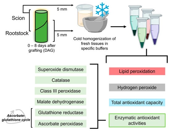 It is hypothesised that the stress during graft healing (mainly caused by wound syndrome and the onset of water deficit in the scion) converges in a generalised oxidative stress, particularly at the site of graft union [14,28]. To buffer this, the plant promotes an antioxidant response to prevent oxidative damage throughout the healing process. This response can be mediated by antioxidant molecules, antioxidant enzymes or a combination of both (Figure 1). The most prominent antioxidant molecules are ascorbic acid and glutathione. Both are part of the ascorbate-glutathione cycle, a biochemical process known to buffer ROS [29,30]. It is regulated by enzymes including ascorbate peroxidase (A-POX) and glutathione reductase (GR). Superoxide dismutase (SOD), catalase (CAT), class III peroxidase (CIII-POX) and malate dehydrogenase (MD) are other key enzymes in the regulation of redox homeostasis.