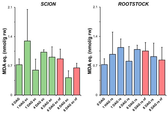 Variation in the level of lipid peroxidation measured as the production of malondialdehyde (MDA) equivalents relative to fresh weight (FW) in scion (sc, green) and rootstock (rs, blue) from 0 to 8 DAG throughout the grafting process. Red columns show non-functional grafts (nf). Mean ± SD (n = 5). No significant differences at the p-value < 0.05 level were detected after ANOVA analysis of variance followed by Tukey’s test.