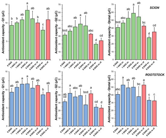 Total antioxidant capacity (TAC) in scion (sc, green) and rootstock (rs, blue) from 0 to 8 DAG throughout the grafting process. Q1 indicates the short-term TAC and Q2 the long-term TAC. Qtotal is the sum of Q1 and Q2. Red columns indicate non-functional grafts (nf). Mean ± SD (n = 5). Different letters indicate significant differences at the p-value < 0.05 level after ANOVA analysis of variance followed by Tukey’s test.