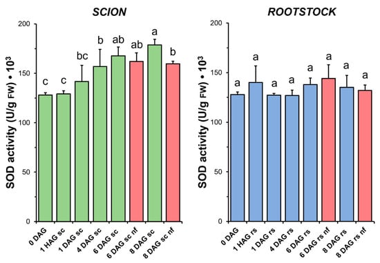 Superoxide dismutase (SOD) activity in scion (sc, green) and rootstock (rs, blue) from 0 to 8 DAG throughout the grafting process. FW, fresh weight. Red columns show non-functional grafts (nf). Mean ± SD (n = 5). Different letters indicate significant differences at the p-value < 0.05 level after ANOVA analysis of variance followed by Tukey’s test.