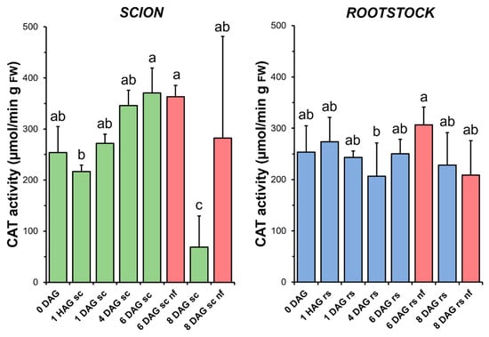 Catalase (CAT) activity in scion (sc, green) and rootstock (rs, blue) from 0 to 8 DAG throughout the grafting process. FW, fresh weight. Red columns show non-functional grafts (nf). Mean ± SD (n = 5). Different letters indicate significant differences at the p-value < 0.05 level after ANOVA analysis of variance followed by Tukey’s test.
