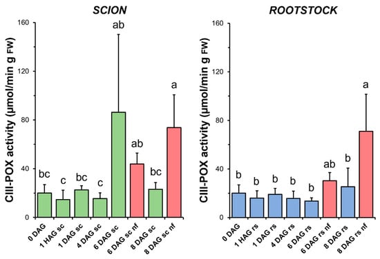 Class III peroxidases (CIII-POX) activity in scion (sc, green) and rootstock (rs, blue) from 0 to 8 DAG throughout the grafting process. FW, fresh weight. Red columns show non-functional grafts (nf). Mean ± SD (n = 5). Different letters indicate significant differences at the p-value < 0.05 level after ANOVA analysis of variance followed by Tukey’s test.