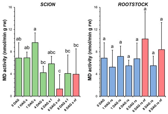 Malate dehydrogenase (MD) activity in scion (sc, green) and rootstock (rs, blue) from 0 to 8 DAG throughout the grafting process. FW, fresh weight. Red columns show non-functional grafts (nf). Mean ± SD (n = 5). Different letters indicate significant differences at the p-value < 0.05 level after ANOVA analysis of variance followed by Tukey’s test.