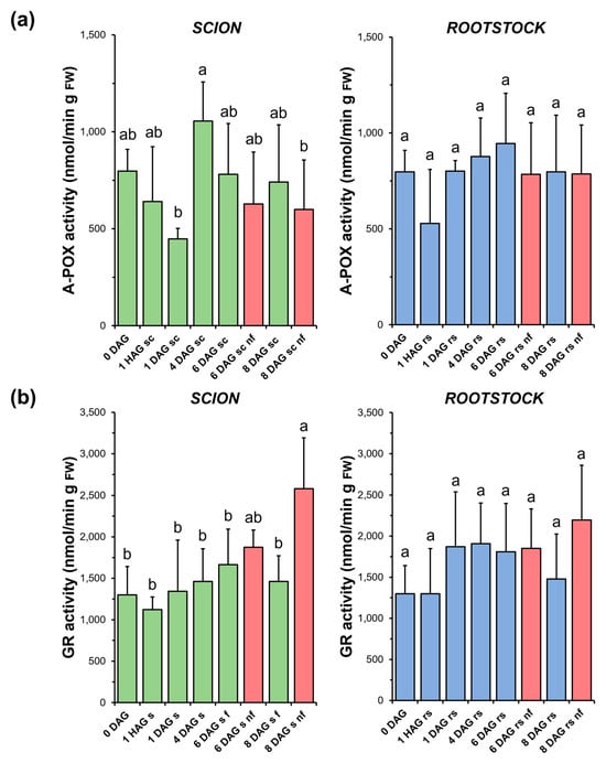 Ascorbate peroxidase (A-POX) (a) and glutathione reductase (GR) (b) activity in scion (sc, green) and rootstock (rs, blue) from 0 to 8 DAG throughout the grafting process. FW, fresh weight. Red columns show non-functional grafts (nf). Mean ± SD (n = 5). Different letters indicate significant differences at the p-value < 0.05 level after ANOVA analysis of variance followed by Tukey’s test.