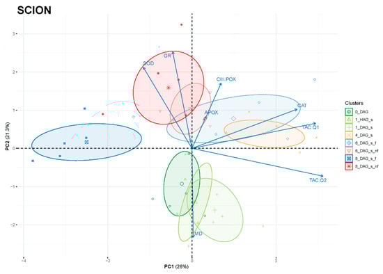 Principal component analysis (PCA) of scion tissues of evaluated variables related to the variation of antioxidant power during the healing process of grafting: total antioxidant capacity (TAC), ascorbate peroxidase (A-POX), glutathione reductase (GR), superoxide dismutase (SOD), catalase (CAT), class III peroxidase (CIII-POX) and malate dehydrogenase (MD) activities. PC1 and PC2 accounted for 47.3% of the variance (26 and 21.3%, respectively). Variables are shown as vectors (arrows). DAG, days after grafting; nf, non-functional; s, scion.