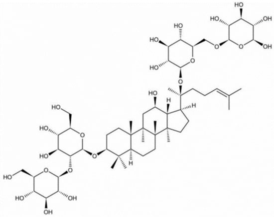 Ginsenoside Rb1 is an active substance extracted from the dried root of ginseng (family Araliaceae), belonging to the tetracyclic triterpenoid saponins (molecular formula: C54H92O23), which are abundant in the stem, root, and buds of Panax ginseng and have neuroinhibitory and stabilising effects in several mammalian models. The structure of ginsenoside Rb1 is shown in Figure 1. Ginsenosides have a similar hydrophobic tetracycline structure; however, they differ in the number of sugar groups. This variability in sugar composition may be related to the specific actions of each ginsenoside. From a chemical structure perspective, its structural features may be relevant in an antidepressant context. Its parent nuclear structure is of the dammarane type, a structure that helps ginsenoside Rb1 regulate signalling pathways in the central nervous system and may exert antidepressant effects by affecting neurotransmitter levels, such as regulating the release and reuptake processes of neurotransmitters, including 5-HT and DA. Additionally, Rb1 has pharmacological effects, such as maintaining blood circulation, improving myocardial ischaemia, and exhibiting anti-arrhythmic, neuroprotective, anti-aging, anti-oxidant, anti-obesity, and anti-tumour properties [19,21,25,26].