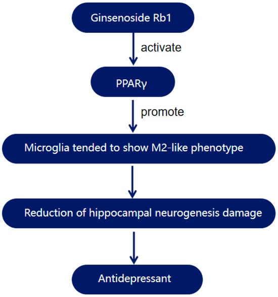 - Zhang, L.; Tang, M.; Xie, X.; Zhao, Q.; Hu, N.; He, H.; Liu, G.; Huang, S.; Peng, C.; Xiao, Y.; et al. Ginsenoside Rb1 induces a pro-neurogenic microglial phenotype via PPARγ activation in male mice exposed to chronic mild stress. J. Neuroinflamm. 2021, 18, 171. [Google Scholar] [CrossRef] [PubMed]
