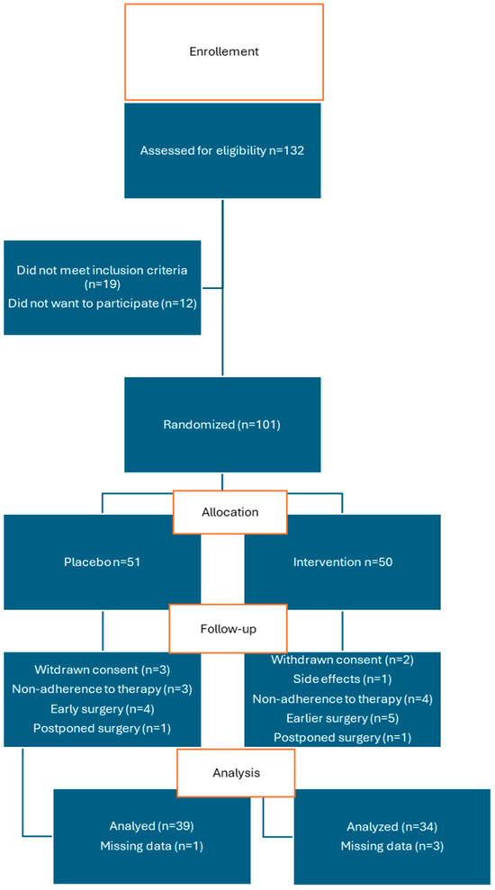 Figure 1 shows the CONSORT flow diagram. We assessed 132 patients for eligibility. We randomized 101 patients into two groups. The ubiquinone group (UQ) received ubiquinone, and the control group received placebo. During the follow-up, nine patients underwent surgery before the completion of seven days of therapy and were therefore removed from the study. We analyzed data from 73 participants.