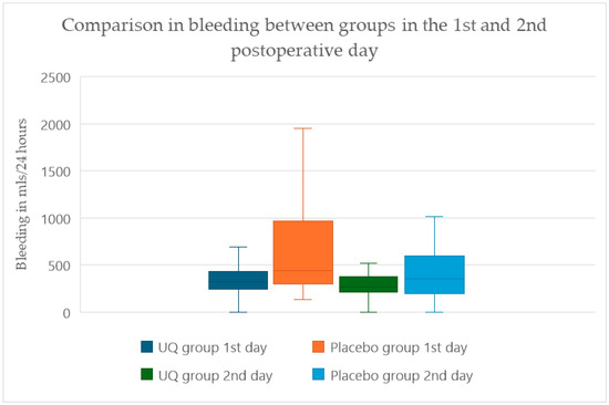 During the first 24 h in the cardiac ICU, patients that did not receive ubiquinone demonstrated a significantly greater blood loss from the thoracic and mediastinal drains, with a median (IQR) drainage of 420 mL (242.5–747.5). Patients receiving ubiquinone therapy showed significantly less bleeding, with a median (IQR) blood loss of 320 mL (230–415; p = 0.047). The effect continued in the second postoperative day, as shown in Figure 2. There was no residual effect of heparin after CPB, as evident by normal coagulation parameters after surgery. Figure 2 shows variability between groups.