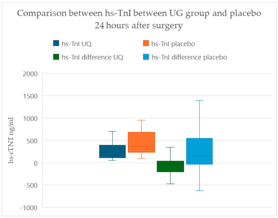 The median hs-TnI level (IQR) was 239.5 ng/mL (113.25–382.75), which was significantly lower in the UQ group, with a notable postoperative decrease in hs-TnI, as illustrated in Figure 3. Patients administered placebo exhibited a significantly elevated hs-TnI after surgery, with a median (IQR) of 366 (234.5–672.5) ng/mL (p = 0.024).
