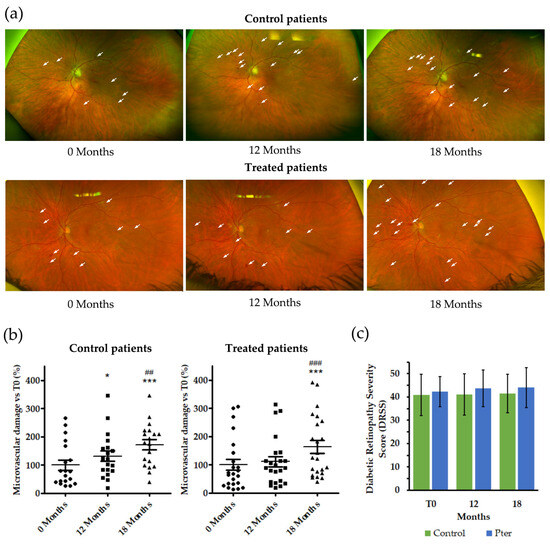The appearance of microaneurysms, venous beading, and small intraretinal hemorrhages are one of the first observable symptoms in the development and progression of DR. In fact, the number of these microvascular lesions is one of the ETDRS staging criteria of the disease. As shown in Figure 1a,b, patients without specific therapy against DR (control patients) accumulate these lesions over time. This harmful effect of hyperglycemia on retinal tissue disappeared in patients treated with Pter for 12 months. The cessation of treatment with the polyphenol worsened the retinal status of the patients. In fact, an increase in the number of microvascular lesions was evident after suspending treatment for 6 months (18 months from the start of therapy) (Figure 1a,b). This precise analysis in DR progression contrasted with the clinical evaluation aimed in the pathology stage, since no differences were observed between the groups (Figure 1c). The ETDRS classification was created with the aim of having a simple and practical basis that would make it possible to predict the evolution of the disease and the treatment of DR before the appearance of severe vision loss. DR is a chronic disease with continuous progression; however, the clinical criteria used for staging the disease are based on discrete levels that group a set of damages. In our study, due to the slow progression of DR due to good glycemic control, an improvement or deterioration in the retina may be invisible because the alterations are insufficient to change the stage.