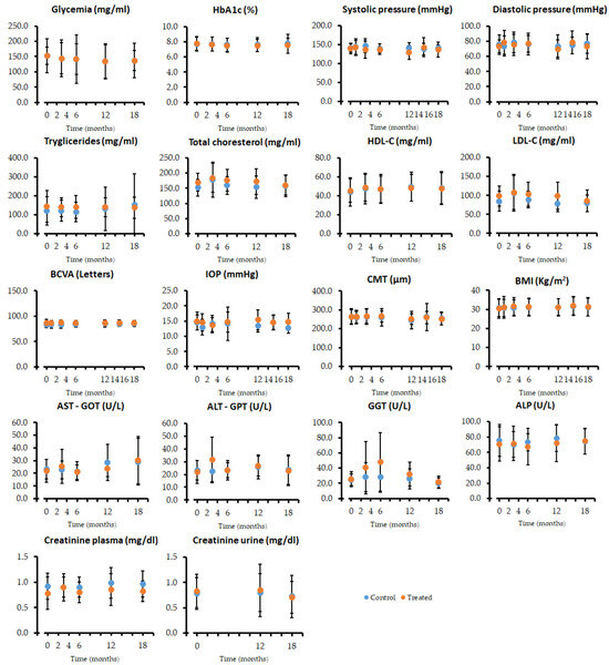 In order to gain insights into the effects of polyphenolic treatment on the risk factors related to the development of DR, we analyzed glycemia, HbA1c, blood pressure, TGs, TC, HDL-C, LDL-C, and BMI, as well as ocular, liver, and kidney function. The levels of all these parameters remained unchanged over the time in which the study was developed (Figure 3).