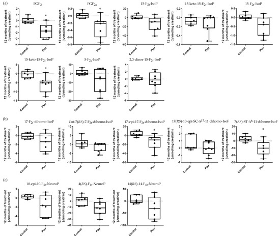 Box plots representing the variation in lipoperoxidation analytes in urine samples from control and treated patients after 12 months. Lipid peroxidation compounds were derived from (a) arachidonic acid, (b) adrenic acid, and (c) docosahexaenoic acid. The data represent the variation suffered by each patient in each parameter after 12 months of treatment. Boxes indicate the 1st and the 3rd quartiles, the average is shown as a black line, and whiskers mark the maximum and the minimum values. Statistical analysis was performed using the Mann–Whitney U test (n = 6 for control and n = 8 for treated; the determination was only carried out in the patients who delivered urine in the visits carried out in months 0, 12, and 18, without failing in any of them). The statistical difference is indicated as * < 0.05 vs. control.