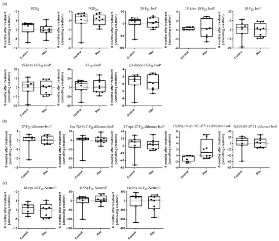Box plots representing the variation in lipoperoxidation analytes in urine samples from control and treated patients after 18 months. Patients were treated with placebo or Pter (250 mg/day) for 12 months. Urine samples were collected 6 months later, after therapy was stopped (total of 18 months). Lipid peroxidation compounds were derived from (a) arachidonic acid, (b) adrenic acid, and (c) docosahexaenoic acid. The data represent the variation suffered by each patient in each parameter. Boxes indicate the 1st and the 3rd quartiles, the average is shown as a black line, and whiskers mark the maximum and the minimum values. Statistical analysis was performed using a Mann–Whitney U test (n = 6 for control and n = 8 for treated; the determination was only carried out in the patients who delivered urine in the visits carried out in months 0, 12, and 18, without failing in any of them).