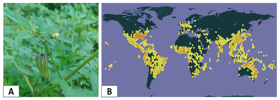 (A) Bolsa mullaca plant (Physalis angulata). (B) Distribution of Physalis angulata (GBIF).