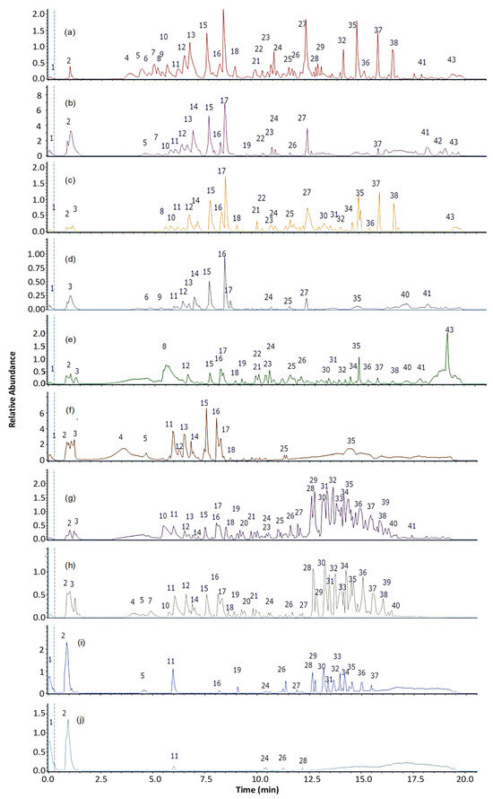 UHPLC-MS chromatograms: (a) ethanolic and (b) aqueous root extract; (c) ethanolic and (d) aqueous stem extract; (e) ethanolic and (f) aqueous leaf extract; (g) ethanolic and (h) aqueous calli extract; (i) ethanolic and (j) aqueous fruit extract.