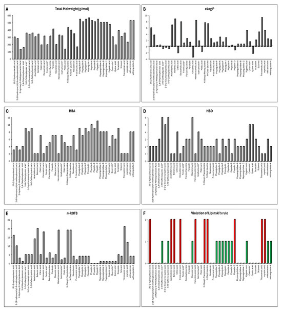 The compounds that presented cLogP values greater than 5 were the following: (R)-2-hydroxystearic acid, arachidonic acid, behenic acid, eicosanoic acid, heneicosanoic acid, N-oleoyl-phenylalanine, N-oleyl-leucine, pygenic acid, tricosanoic acid, and myristic acid (Figure 3B). In addition to a high molecular weight and lipophilicity, a compound may reduce its ability to permeate the lipid bilayer or permeate the blood–brain barrier due to the large number of hydrogen donor bonds, hydrogen acceptor bonds, and rotatable bonds [47].