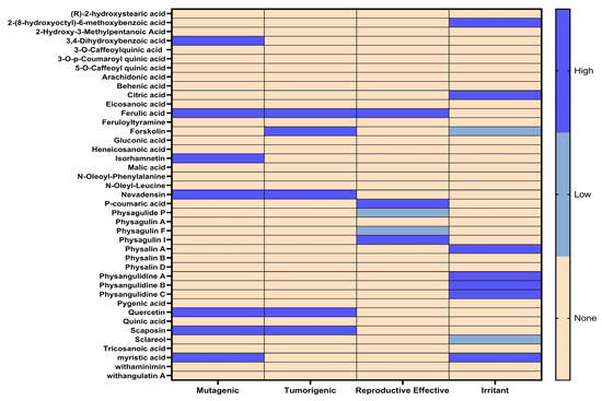 In addition to the pharmacokinetic properties, the toxicological risks of the compounds extracted from Physalis angulata were evaluated by in silico analysis using the Osiris Data Warrior computational tool. The toxicological risks that were analyzed in each of the compounds were irritation, tumorigenicity, mutagenicity, and reproductive toxicities (Figure 4). The results obtained from this analysis were represented by a heat map where the results can be analyzed intuitively using a color differential.