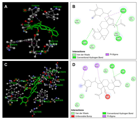 The compound physagulin A has a higher affinity and, therefore, a possible greater inhibition of the acetylcholinesterase enzyme (TcAChE). Physagulin A presented three hydrogen bond type interactions with residues Gly119, Tyr121, and Tyr334, which confirmed significant stability in the binding site in the acetylcholinesterase enzyme (TcAChE) (Figure 5A,B). In addition to hydrogen bond interactions, physagulin A presented four van der Waals type interactions with residues Asp72, Gly118, Trp279, and Phe330, and a π-sigma type interaction with residue Tyr334 (Figure 5B). These interactions made the physagulin A compound present good stability in the binding site; however, it is observed that it did not present direct interactions with the amino acids involved in the inhibition (Ser200 and His440) of the acetylcholinesterase enzyme (TcAChE) (Figure 5A,B). The compound withaminimin was one of the compounds that presented a good affinity in the binding site of the acetylcholinesterase enzyme (TcAChE), although it was not the one that presented the best binding energy. The compound withaminimin presented direct hydrogen bond type interactions with the Ser200 residue and van der Waals type interactions with residue His440; which are both residues involved in the inhibition of acetylcholinesterase (TcAChE) (Figure 5C,D). In addition to the interactions mentioned above, the compound withaminimin presented one more hydrogen bond interaction with the Gly119 residue, and two interactions of π-sigma with residues Trp279 and Phe331 (Figure 5D). The compound withaminimin presented a lower binding energy compared to the compound physagulin A (Table 5) because it presented two unfavorable interactions between the hydroxyl group of withaminimin and the Tyr121 residue (Figure 5C,D).