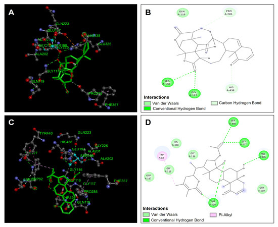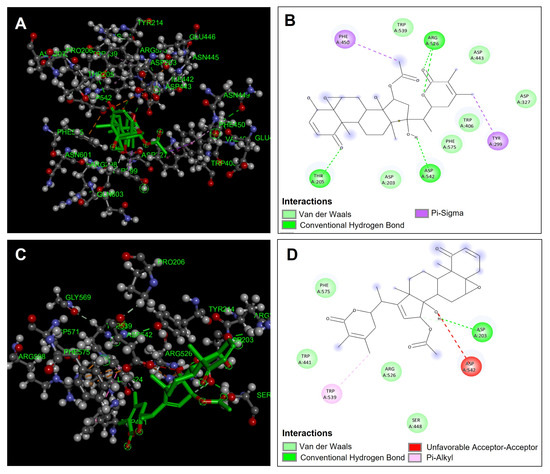 The compound physagulin A was again one of the compounds that presented the highest binding affinities. This compound presented only a hydrogen bond interaction between the hydroxyl group and the Asp203 residue. Also, a π-alkyl type interaction was presented with residue Trp539 and four van der Waals type interactions with residues Trp441, Ser448, Arg526, and Phe575 (Figure 8C,D). This compound had a lower behavior compared to the physagulide P compound because it presented a favorable acceptor–acceptor interaction between the hydroxyl group of its structure and the Asp542 residue, which causes its stability to be lower compared to physagulide P (Figure 8D).