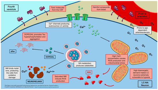 Beyond being exposed to exotoxins, some hypotheses suggest that the LC itself might produce harmful compounds [109]. As said above, one of the most iconic features of LC is the production of NM during the catabolism of NA [32,110]. NM binds iron and copper ions, which are crucial for neuronal metabolism, protecting NA cells from oxidative damage [111]. However, the capability of LC neurons to store NM-metal ions compounds might be overcome with aging, producing possible detrimental consequences [111]. Due to the loss of NM’s ability to bind metal ions, the latter might induce the production of ROS, which, in turn, might cause cell death through apoptosis [111]. Then, dead neurons might release NM granules, which could activate nearby microglial cells and trigger neuroinflammatory processes, which might increase cell stress within other NM-containing neurons, leading to their death and a vicious cycle [112].