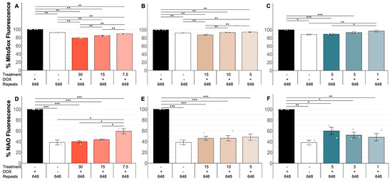 Natural antioxidants reduce OS in a DM1 glial cell model. Plots (A–C) show the results of quantifying the superoxide anion (% MitoSox Fluorescence) in MIO-M1 CTG(648) in the presence (+) or absence (−) of DOX and different concentrations of antioxidants (described in the text). As can be seen, levels of superoxide anion are significantly increased due to the CTG repeat expansion (two first columns), which are significantly decreased after treating the cells with polyphenol extracts from Rubus adenotrichos (A), from polyphenol extracts from Bactris guineensis (B), and NAC (C). A dose-dependent effect of the antioxidant is seen for all treatment conditions. Plots (D–F) show the results of quantifying lipid peroxidation in the glial cell model under study. As can be seen, levels of LP are significantly increased due to the CTG repeat expansion (two first columns), which are significantly decreased after treating the cells with polyphenol extracts from Rubus adenotrichos (D), from polyphenol extracts from Bactris guineensis (E), and NAC (F). A dose-dependent effect of the antioxidant is seen for antioxidants except from NAC (F). To allow a proper comparison, data were given as a percentage. ANOVA (Tukey), * = p < 0.05, ** = p < 0.001, *** = p < 0.0001.